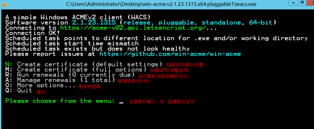 我们将win-acme.zip下载后,解压出来见下图,直接运行wacs.exe