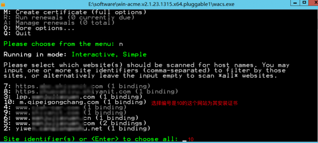 我们输入:N,创建默认配置的证书。选择输入编号为10的,为其创建证书。