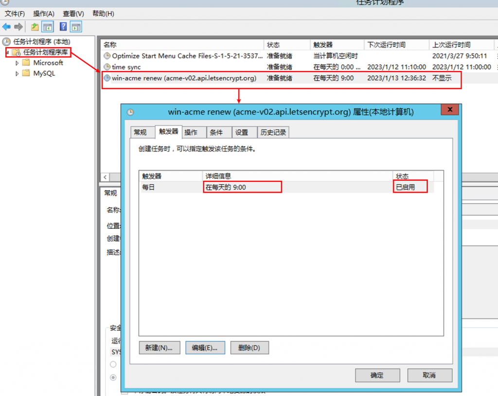 我们可以看到在任务计划程序库里面win-acme已经为我们创建了一个每天9:00执行的一个检测证书是否到期的任务计划。我们可以通过修改一下这个触发时间来测试是否真正执行了检测任务。