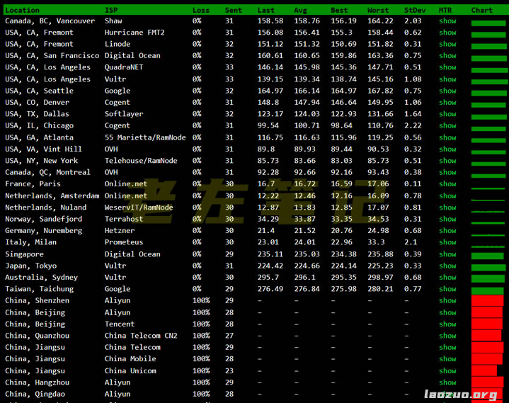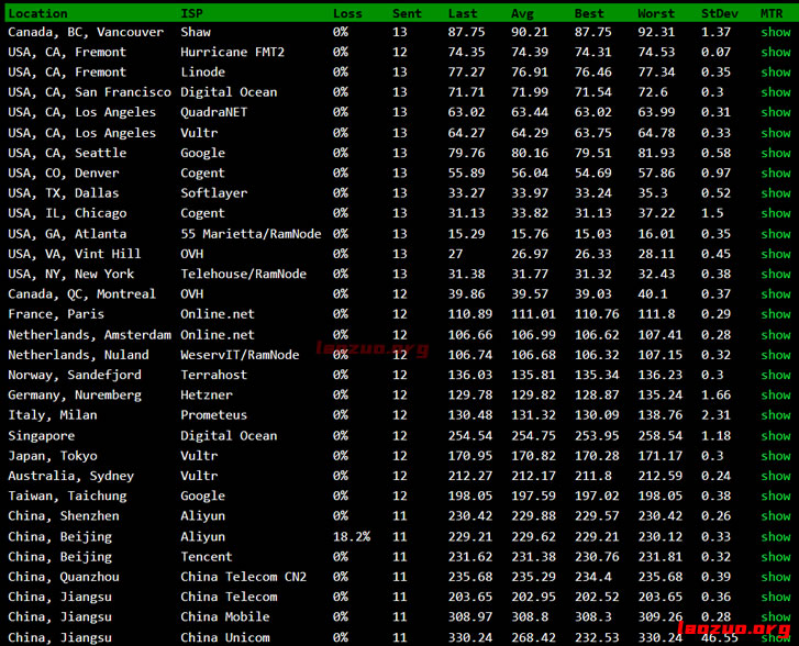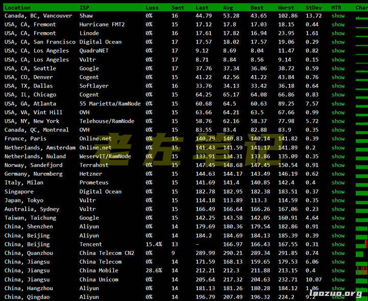 目前有四个机房,我们可以参考下看看官方提供的测试IP提供的测速记录。
