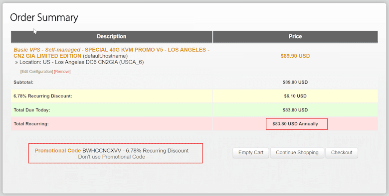 我们可以看到优惠后仅需要83.8美元一年,续费同价。如果有需要大带宽且CN2优化线路的多就机房的VPS主机可以建议选择。