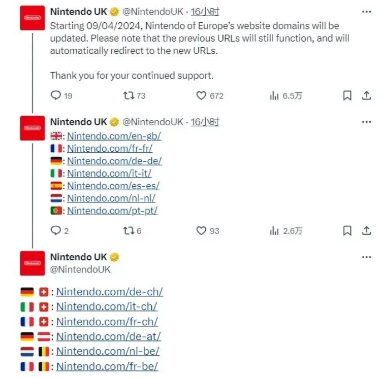 今年二月,任天堂将其日本网站的URL从“nintendo.co.jp”更改为了“nintendo.com/jp”,而现在,任天堂又更新了其欧洲网站的URL,将所有URL统一保持为“nintendo.com”开头,用户可在后方输入特定区域缩写来访问不同国家地区的任天堂官网,例如英国的官网就是“nintendo.com/en-gb/”。