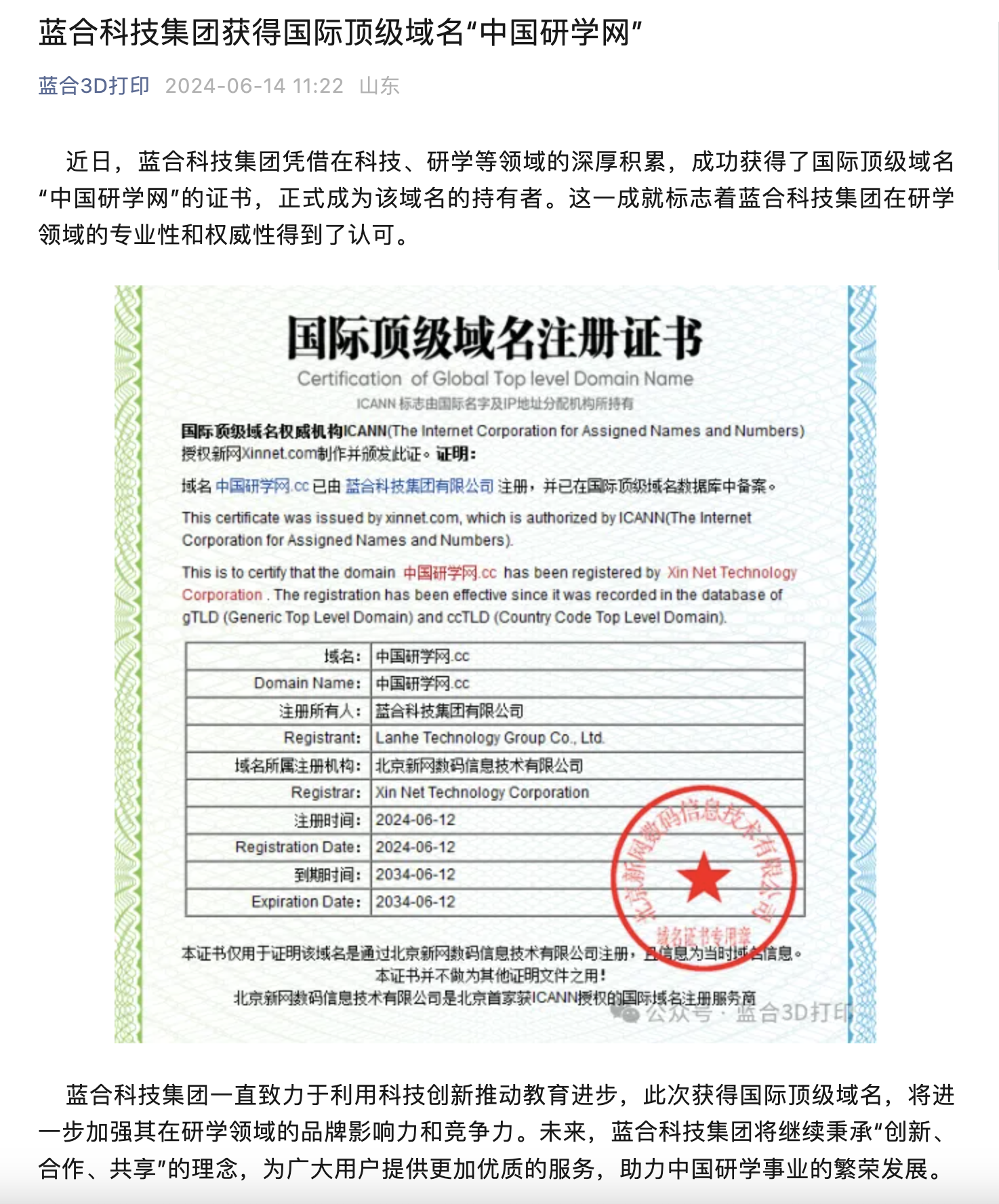 近日,蓝合科技集团凭借在科技、研学等领域的深厚积累,成功获得了国际顶级域名“中国研学网”的证书,正式成为该域名的持有者。这一成就标志着蓝合科技集团在研学领域的专业性和权威性得到了认可。