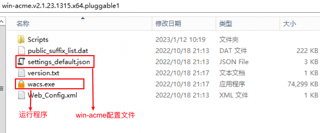 我们将win-acme.zip下载后,解压出来见下图,直接运行wacs.exe