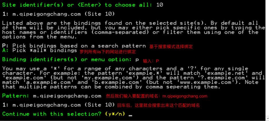 我们输入P,选择基于搜索模式选择绑定,回车后让我们输入需要配置域名。域名输入好后再次回车,然后他就找到了刚输入的这个域名。