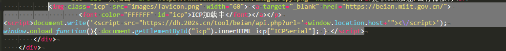 记得之前有个文章是自动获取ICP北岸的本地接口,后来发现这种方法会使网站的加载速度变慢,这里给到大家自动秒加载ICP北岸的接口,此接口为防止恶意访问加了防盗链,需要用的话留言,免费给到大家使用,复制以下代码到要展示ICP北岸号的地方: