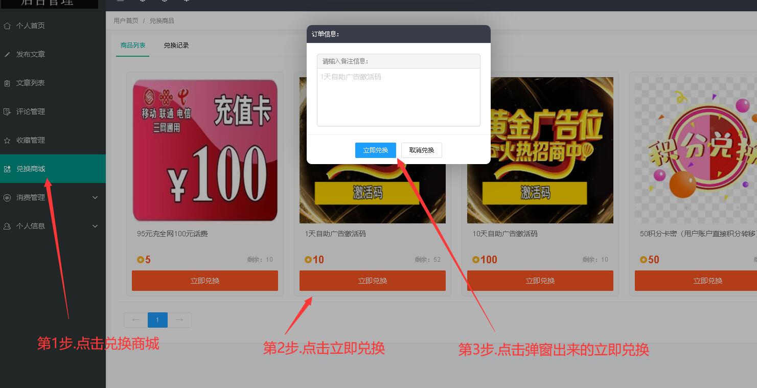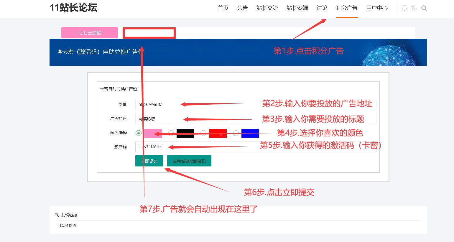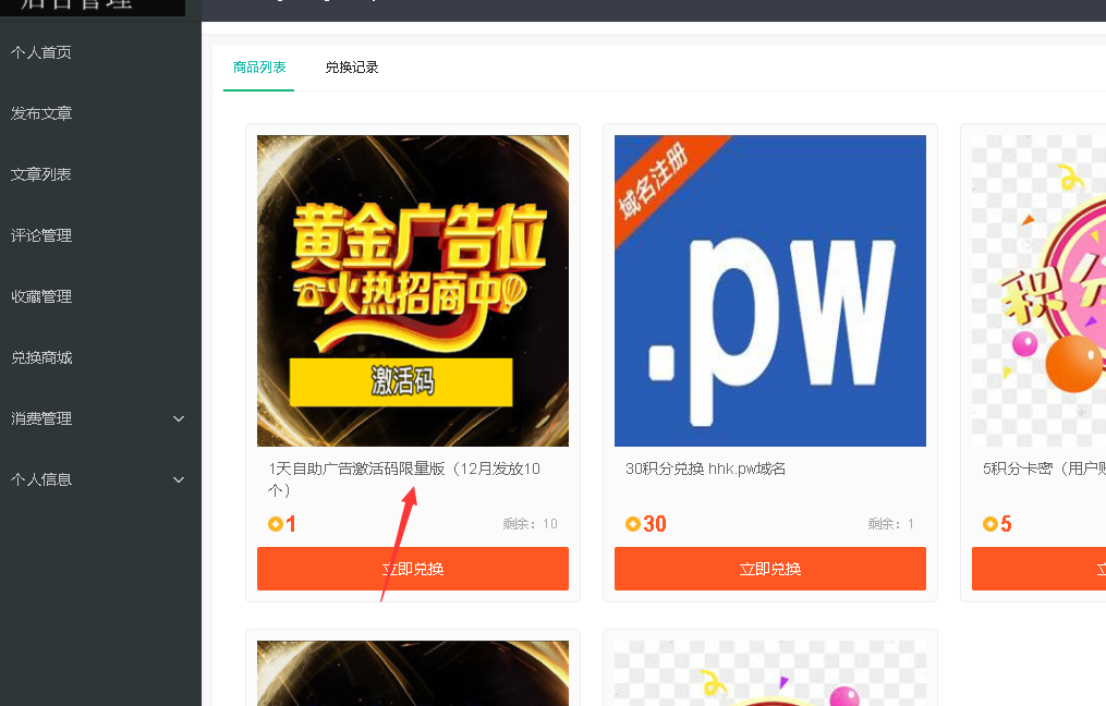 每日签到可获得积分,商城1积分可兑换 1天自助广告激活码限量版 此激活码每月限量发放10-100个,根据会员数量灵活调整。兑换商城地址:https://www.11.pw/Ucenter#/ExcShop